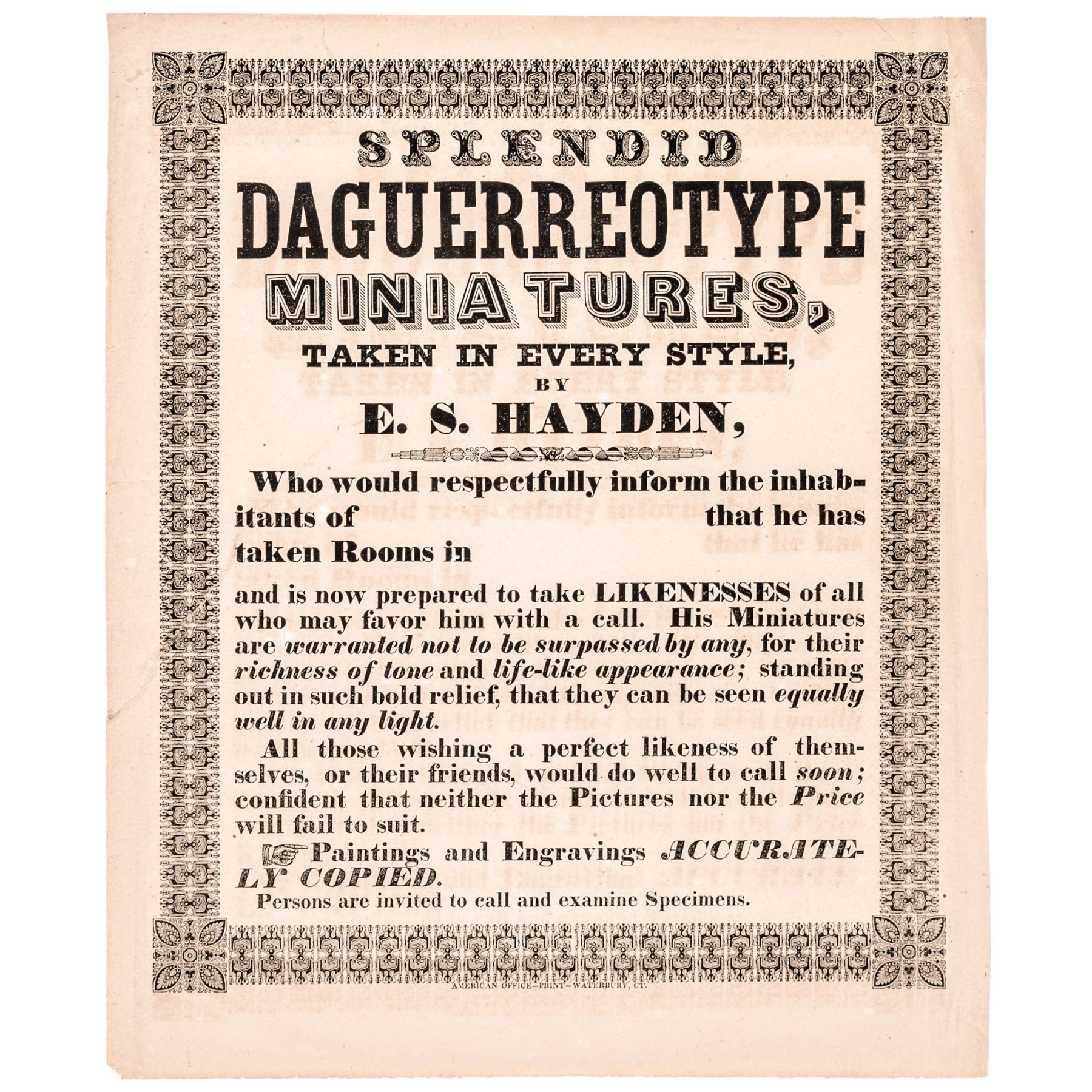 C 1850 Great Daguerreotypes Advertising Broadside By E S Hayden Waterbury Ct